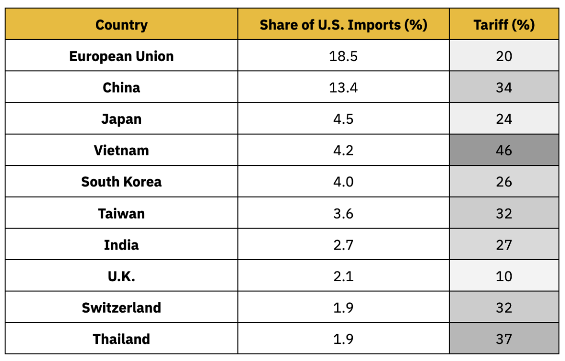 图表1:2025年4月2日“解放日”关税覆盖多达60个国家,其中包括多个美国主要贸易伙伴注:该表格反映了4月2日美国对其前十大进口来源国征收的“对等”关税情况。