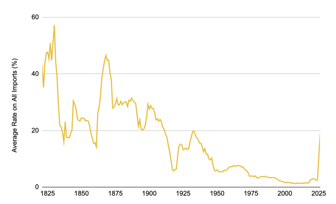 这些政策使美国的进口税率飙升至自1930年《斯穆特-霍利关税法》实施以来的最高水平,该法案曾在大萧条时期对数千种商品征收全面性关税。根据现有数据,美国的平均关税率已升至约18.8%,部分估算甚至高达22%——相比2024年的2.5%,这是一次极为剧烈的跃升。