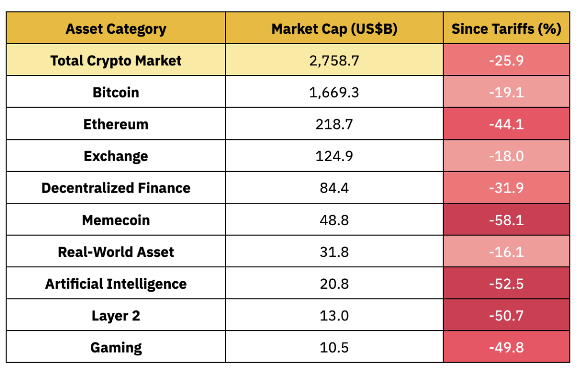 剧烈的市场反应也凸显出加密资产在剧烈“风险规避”时期的表现特征:比特币(BTC)下跌了19.1%,大多数主流山寨币跌幅与其相当甚至更大。以太坊(ETH)跌幅超过40%,高贝塔板块(如Meme币与人工智能相关代币)则暴跌超过50%。本轮抛售抹去了年初以来加密市场的多数涨幅,截至4月初,即便是BTC的年初至今(YTD)收益也已转为负值——尽管其在2024年表现强劲。