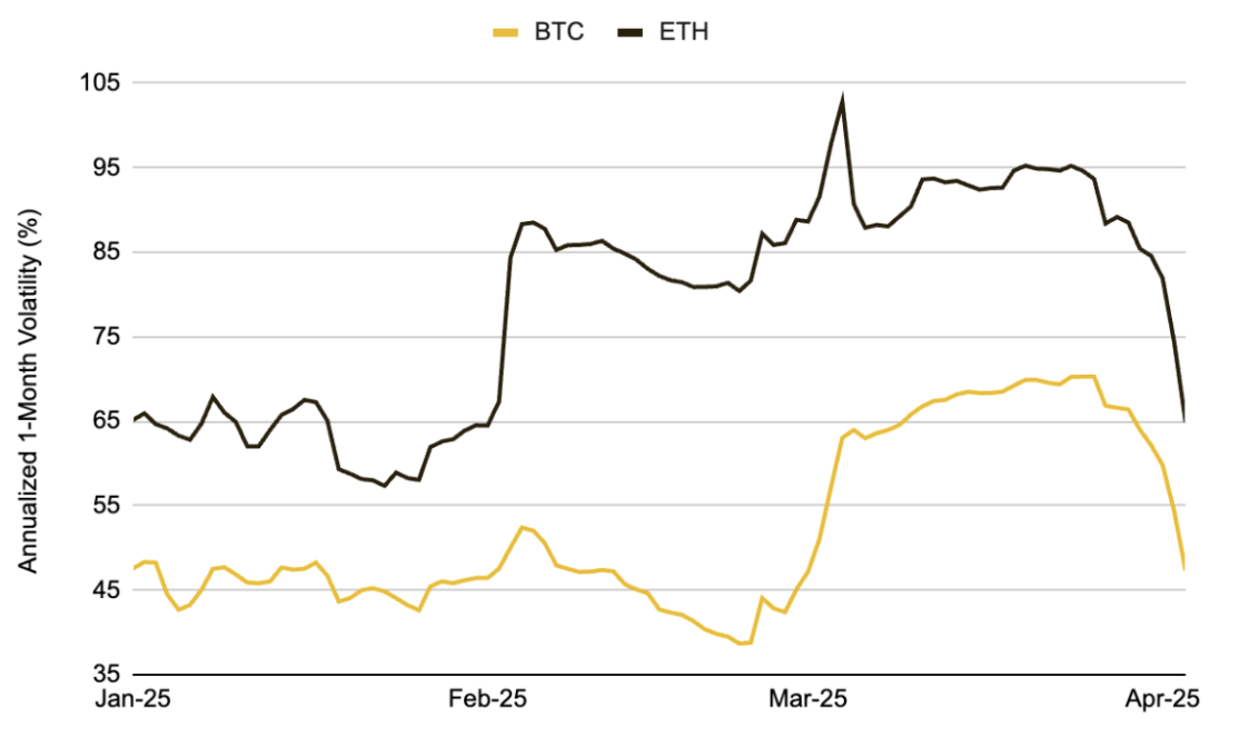 图表6:在此阶段,BTC的一月实际波动率上升至70%以上,ETH超过100%,反映出关税公布后的市场剧烈波动
