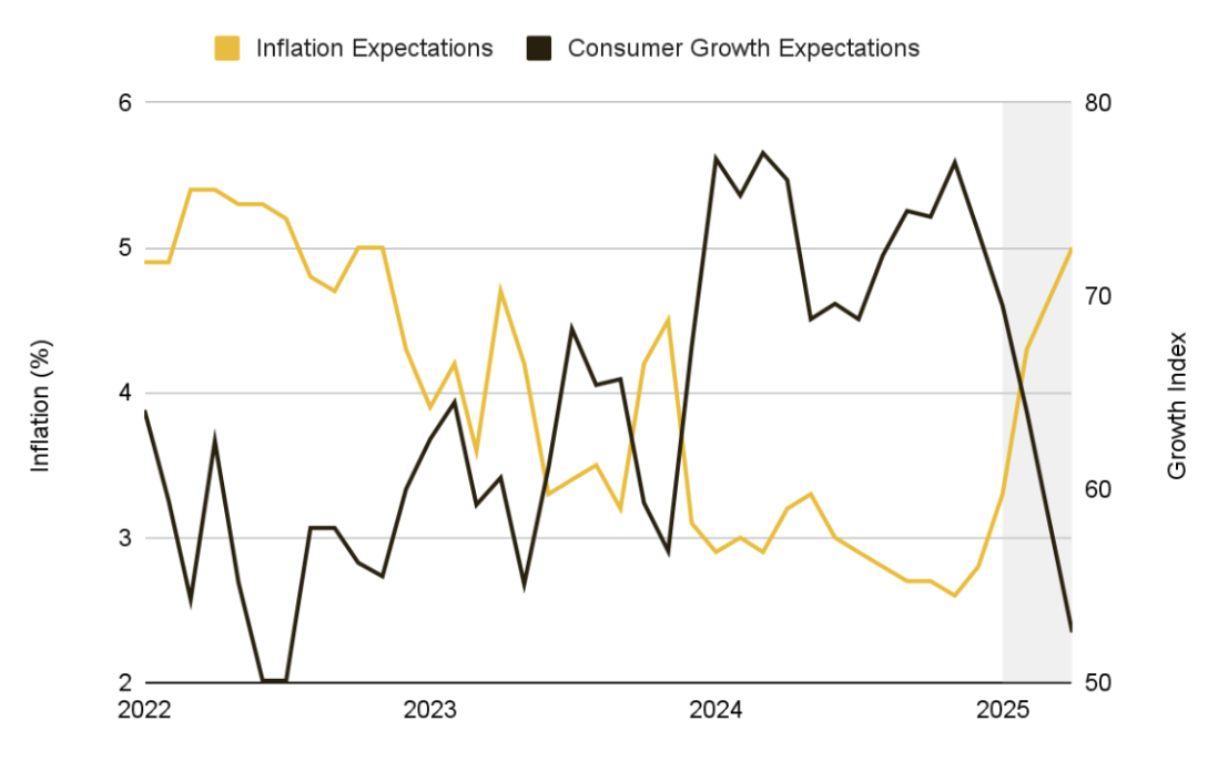 新关税相当于对进口商品征收了大量额外税费,正值美联储试图压制物价增长之际,为通胀压力火上浇油。市场上已显现出对这些措施可能破坏通胀回落进程的担忧。市场化指标如一年期通胀掉期已飙升至3%以上,而消费者调查中的预期也升至5%附近,均显示人们普遍预期未来12个月内物价将持续上行。