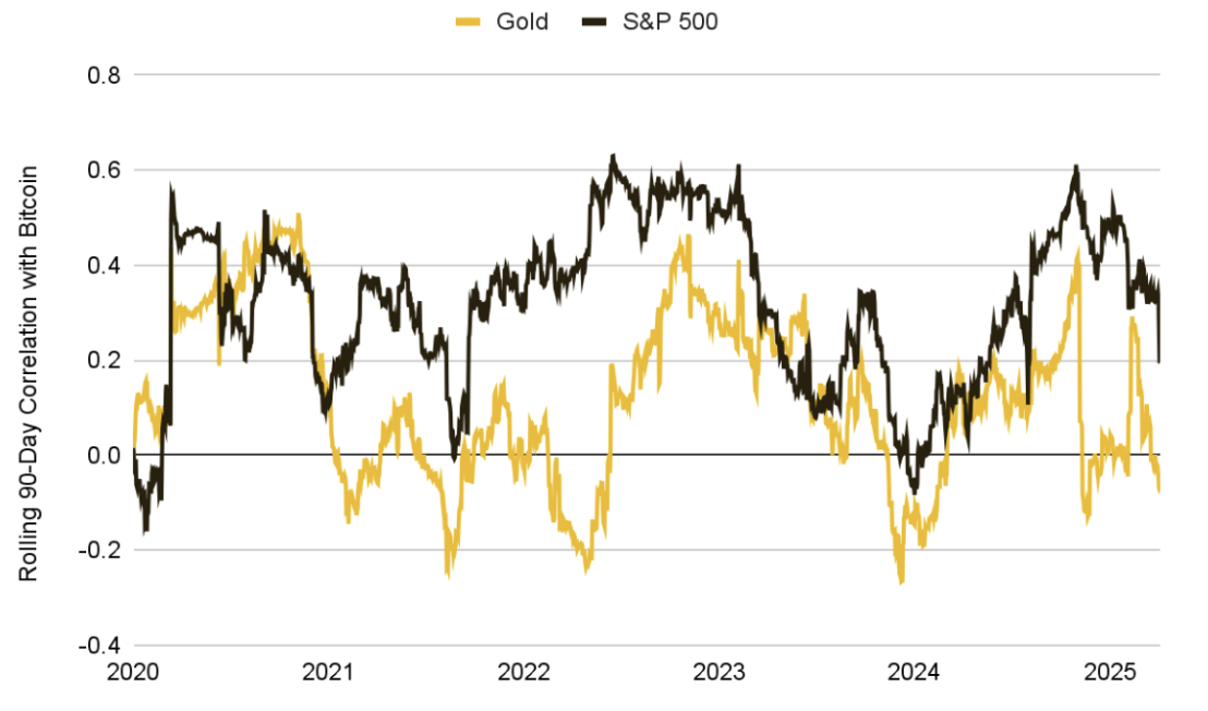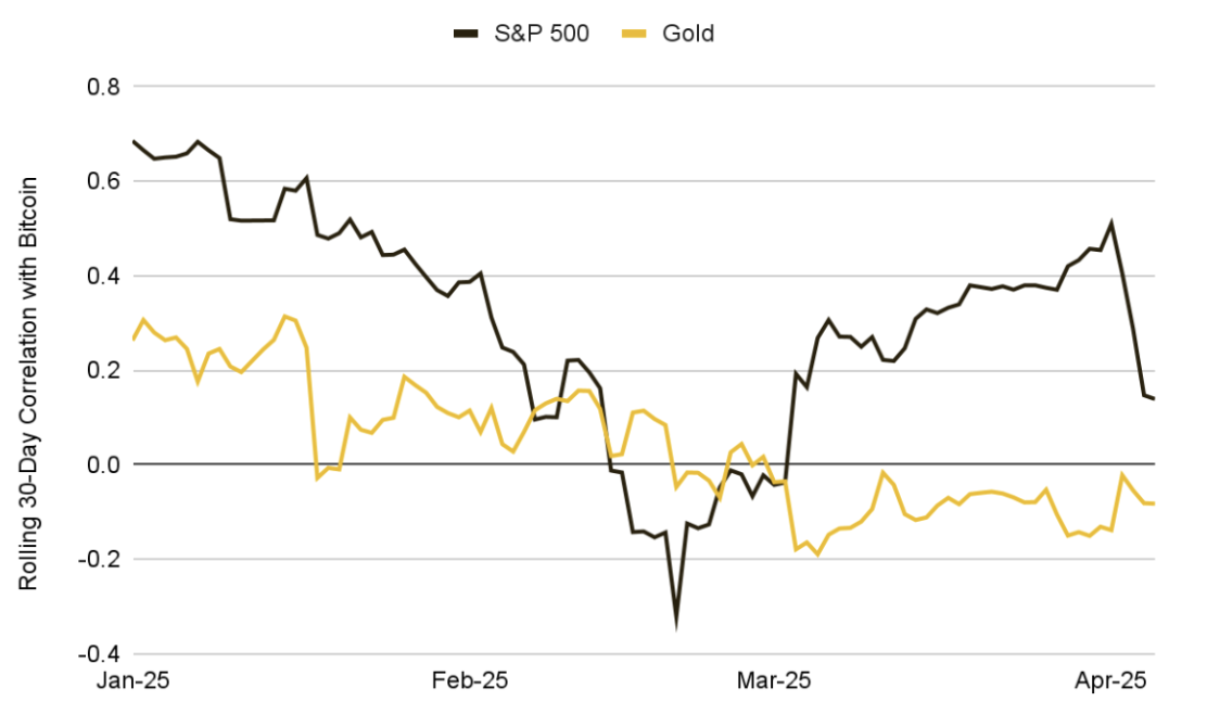 相比之下,比特币与传统避险资产如黄金的相关性则明显削弱——原本中性至正向的关系在4月初变为–0.22的负相关。