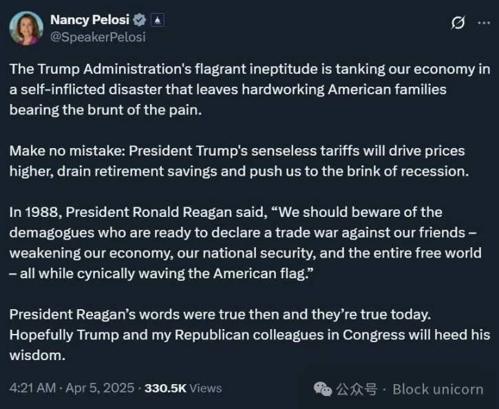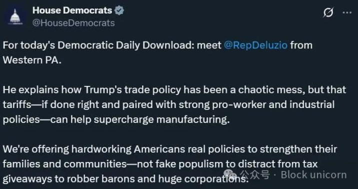这并不意味着民主党人完全保持沉默。许多人发表了反对关税的声明,比如南希·佩洛西的这篇: