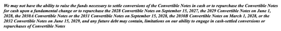 「我们可能无法筹集足够资金用于以下用途:(1) 以现金结算可转换票据的转换;(2) 在发生重大变更时以现金回购可转换票据;或 (3) 在下列日期以现金回购各批次票据:2028 年可转换票据(2027 年 9 月 15 日)、2029 年可转换票据(2028 年 6 月 1 日)、2030A 或 2031 年可转换票据(2028 年 9 月 15 日)、2030B 可转换票据(2028 年 3 月 1 日)、2032 年可转换票据(2029 年 6 月 15 日)。此外,未来新增债务可能包含对我们以现金结算转换或回购可转换票据能力的限制条款。」