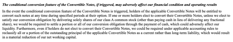 若可转换票据的或有转换条款被触发,相关票据持有人有权在特定期间内随时选择转换其票据。若持有人行使转换权,除非本公司选择仅以 A 类普通股(零股以现金支付除外)履行转换义务,否则我们必须以现金支付部分或全部转换款项,这可能对我们的流动性造成不利影响。此外,即便持有人未选择转换,根据相关会计准则,我们可能需将相关票据的全部或部分未偿还本金重新分类为流动负债而非长期负债,这将导致我们的净营运资本大幅减少。」