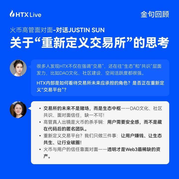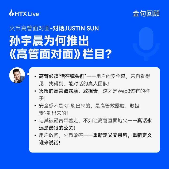 我还想讲讲对《火币高管面对面》栏目的期待。这是我提议做的栏目,因为加密用户最重要的就是要有安全感。有的交易所高管不露面,可能就会影响信任。我们做这样一个出镜的栏目,让火币HTX的高管和用户保持密切的沟通,希望能增加用户的信任感,让关心我们的人能够看到最新动态,我们也能得到很好的用户反馈。