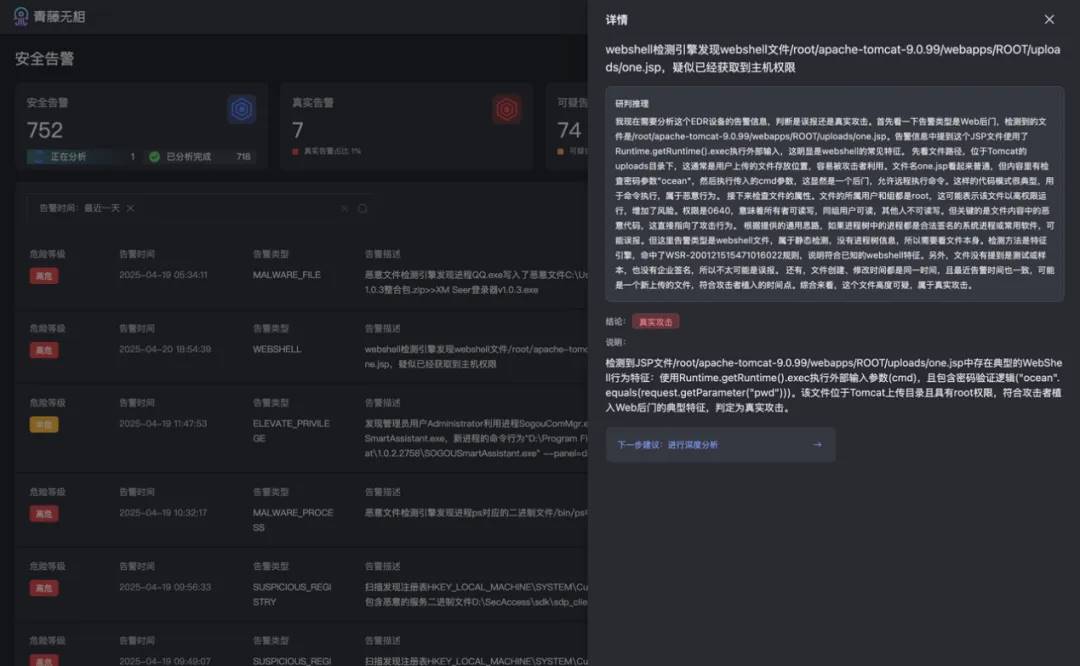 面对真实威胁如 Webshell 攻击,智能体通过代码特征提取、文件权限分析等跨维度关联,秒级确认攻击有效性。传统需多部门协作、耗时数日的深度溯源(如上传播径还原、横向影响评估),现由系统自动串联主机日志、网络流量、行为基线等数据流,生成完整攻击链报告,将响应周期从「天」压缩至「分钟」。