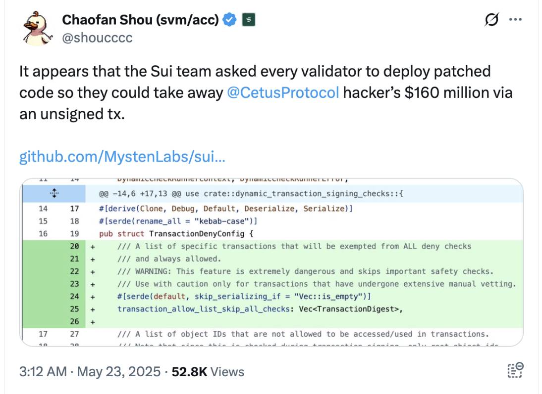 (注意:Sui 验证者反馈表示并没有收到「要求」,Chaofan 后续也表示 Sui 验证者目前没有部署相关代码。)
