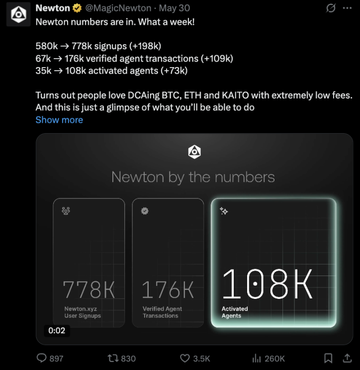 自 5 月 Kaito Earn 上线以来,Kaito 已深度切入用户转化赛道,充分依托我们高质量、高粘性的用户基底展开布局。上周数据显示,Kaito 已激活 33,699 名活跃代理,其交易量约占 Newton 平台总交易量的三分之一。这些代理实际投入资金持续定投比特币、KAITO 等资产,产生了真实的交易手续费。