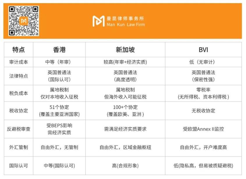 • 控股层:BVI 公司(保密性)+ 香港公司(融资与供应链统筹)