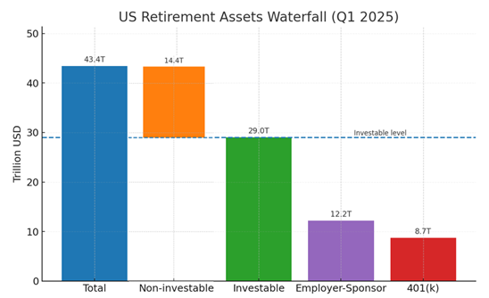 根据美国投资公司协会(ICI)2025年第一季度的数据,美国养老金市场总规模高达43.4万亿美元。在这片广阔的资金海洋中,真正可由个人进行投资决策的部分约为29万亿美元。而在这29万亿美元中,401(k)计划独占8.7万亿美元,占比高达30%。这笔巨额资金,正是此次新政瞄准的“金矿”。